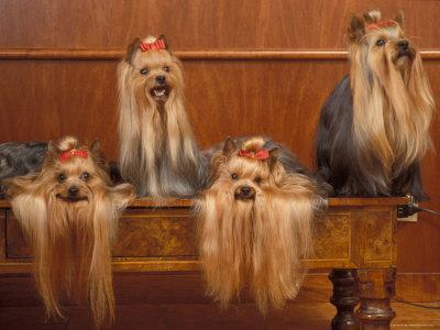 Domestic Dogs Four Yorkshire Terriers On A Table With Hair Tied Up And Very Long Hair Photographic Print Adriano Bacchella Allposters Com
